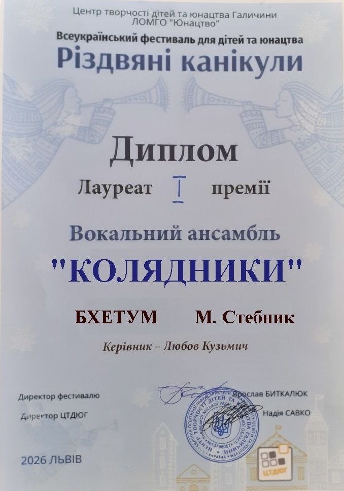 Вихованці вокального гуртка Стебницького БХЕТУМ стали Лауреатом І премії на Всекраїнському фестивалі дітей та юнацтва "Різдвяні канікули"