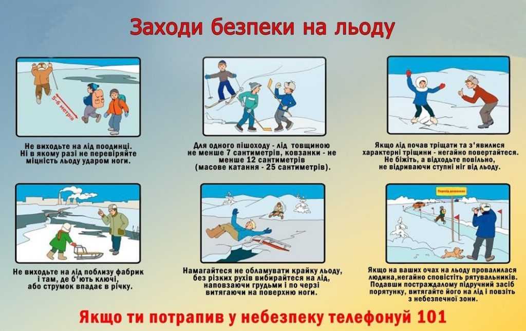 В будь-якому разі заборонено виходити на кригу поодинці. Пересуватися по льоду потрібно невеликими групами по 2-3 особи на деякій відстані 5-10 м. один від одного.