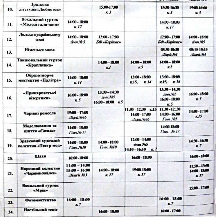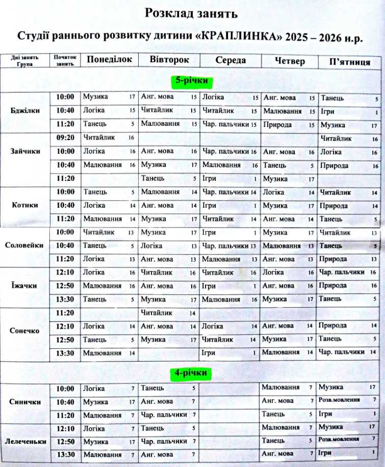 * Розклади занять Студії "Краплинка" та